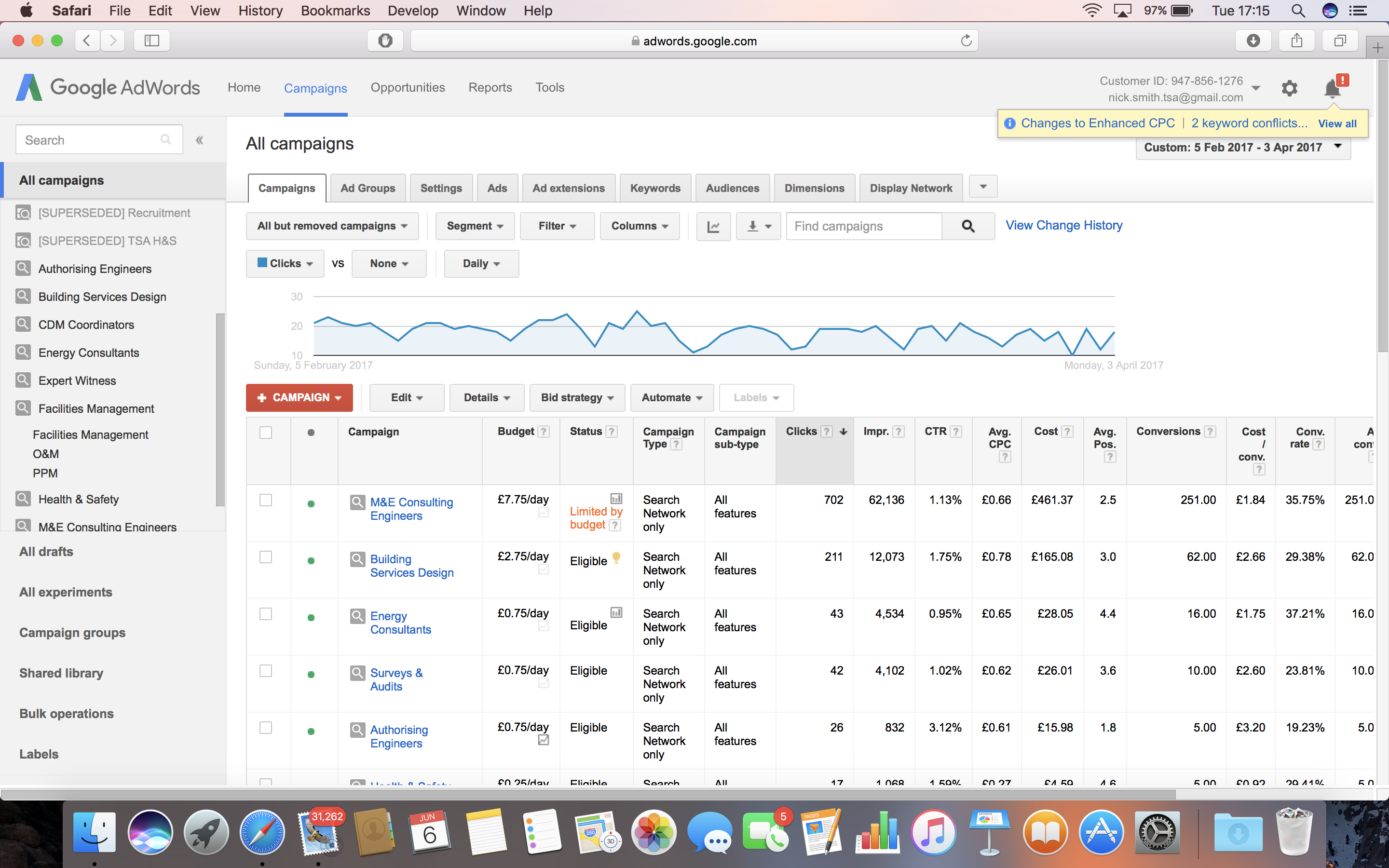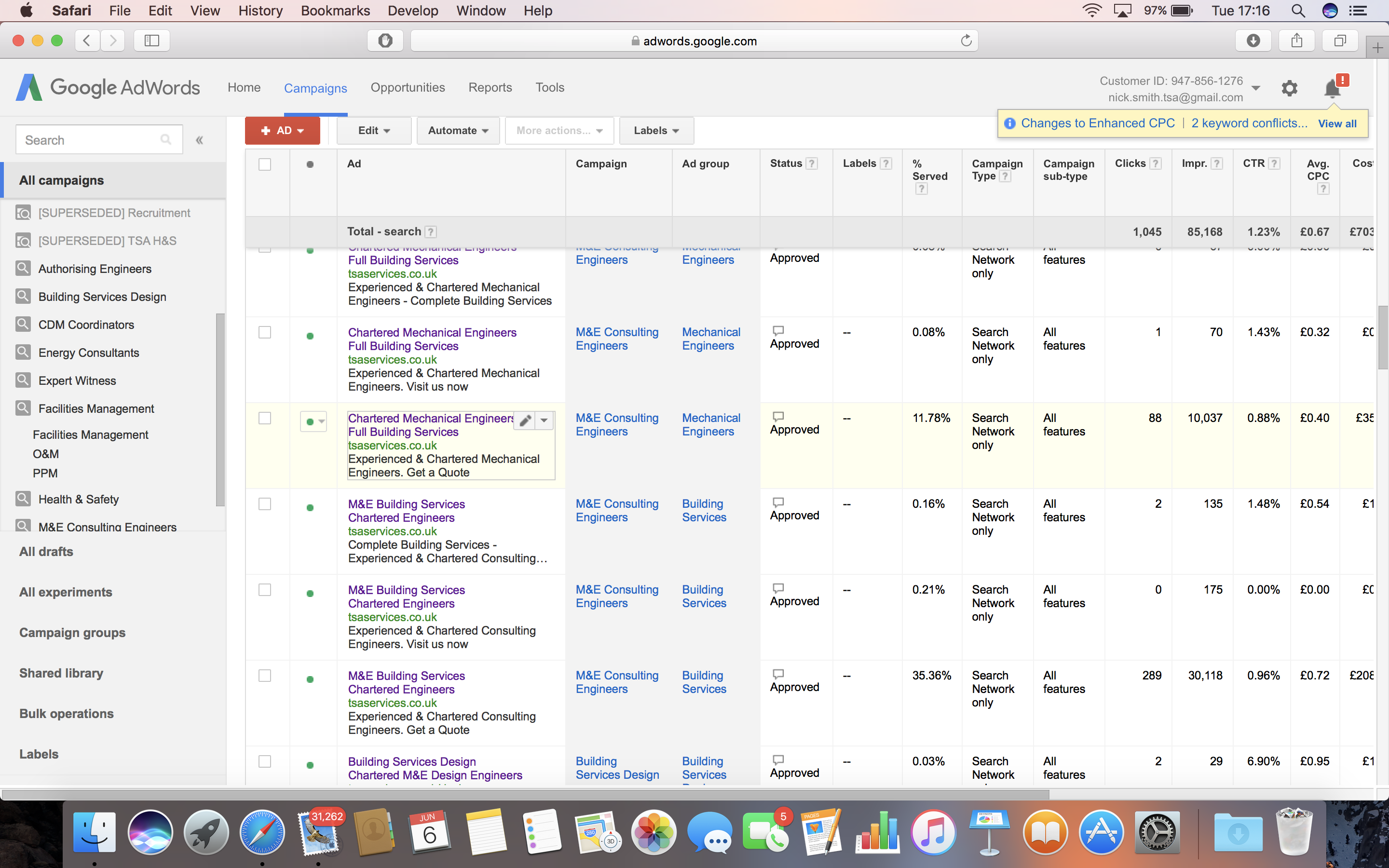 Description: an interesting task, requiring carefully analysis of every service area TSA offered and the creation of separate niche campaigns, including multiple ads per campaign. Once built there seemed to be many more enquiries, many having said that they found us from our ads, and has been easy to manage since. I created an initial PPC campaign years prior to implementing this much improved plan.